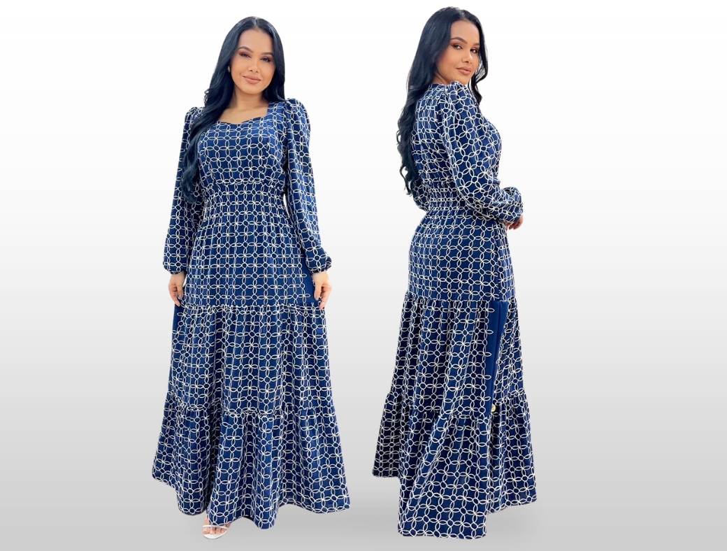 VESTIDO PÉROLA,TECIDO CREPE BORDADO,ELASTEX TOTAL NA CINTURA, FINALIZAÇÃO COM ELÁSTICO NAS MANGAS